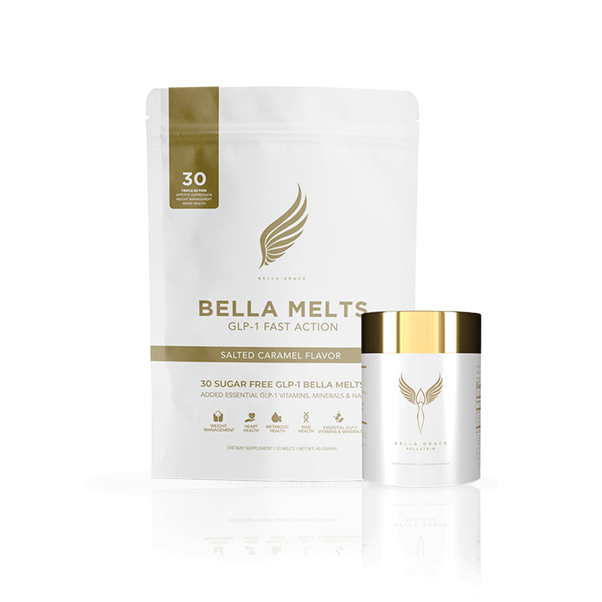 Ta kombinacija naravno aktivira proizvodnjo GLP-1 v telesu brez igel ali hudih stranskih učinkov. Bella Melts in BellaTrim skupaj podpirata pametnejši in trajnejši pristop k uravnavanju telesne teže, saj umirjata lakoto, zmanjšujeta stresne hormone in podpirata zdrav presnovni sistem.